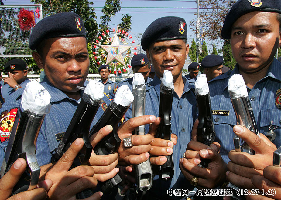 12月29日,菲律賓首都南部的塔吉格市警察部隊(duì)為了防止警務(wù)人員在慶祝新年時胡亂開槍,下令用膠紙把槍口封起來。圖片來源:中國新聞網(wǎng)>>點(diǎn)擊觀看詳細(xì)內(nèi)容