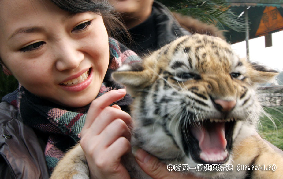 2010年1月1日,重慶野生動(dòng)物世界把出生一個(gè)月的3胞胎小老虎抱到園區(qū)與游人親密接觸;⑨虃児郧煽蓯塾植皇涞男蜗笞層稳藧鄄会屖,游人們紛紛與之親密接觸、合影。圖片來源:中國新聞網(wǎng)>>點(diǎn)擊觀看詳細(xì)內(nèi)容