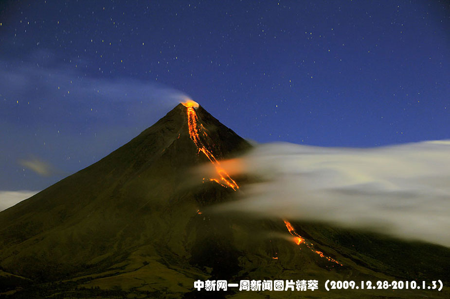 周二(29日)在菲律賓黎牙實(shí)比,巖漿從馬榮火山山口流出。由于該火山開始爆發(fā),大約有5萬人被撤離到臨時(shí)房屋中。圖片來源:中國新聞網(wǎng)
