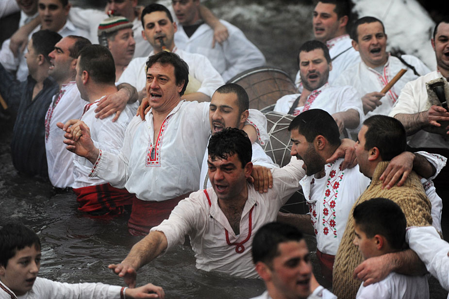 1月6日,在保加利亞卡洛菲爾市,人們?cè)诒涞暮铀刑鸨<永麃喢耖g舞蹈霍洛舞,相互祝福在新的一年里身體健康,事事順?biāo)。圖片來(lái)源:中國(guó)新聞網(wǎng)