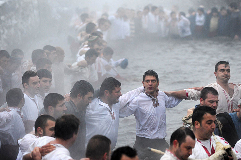 1月6日,在保加利亞卡洛菲爾市,人們在冰冷的河水中跳起保加利亞民間舞蹈霍洛舞,相互祝福在新的一年里身體健康,事事順?biāo)。圖片來源:中國新聞網(wǎng)