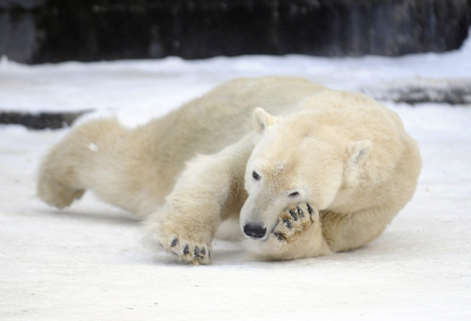 1月6日,德國(guó)羅斯托克動(dòng)物園內(nèi),一只北極熊愜意的享受著雪地的樂(lè)趣。