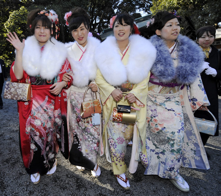 今年的1月11日,是日本傳統(tǒng)的成人節(jié),所有滿20歲的年輕人將宣告自己邁進了成人行列。1月8日,日本一家公司年滿20歲的年輕女孩紛紛穿上和服,到廟宇中祈福,提前慶祝成人節(jié)的到來。