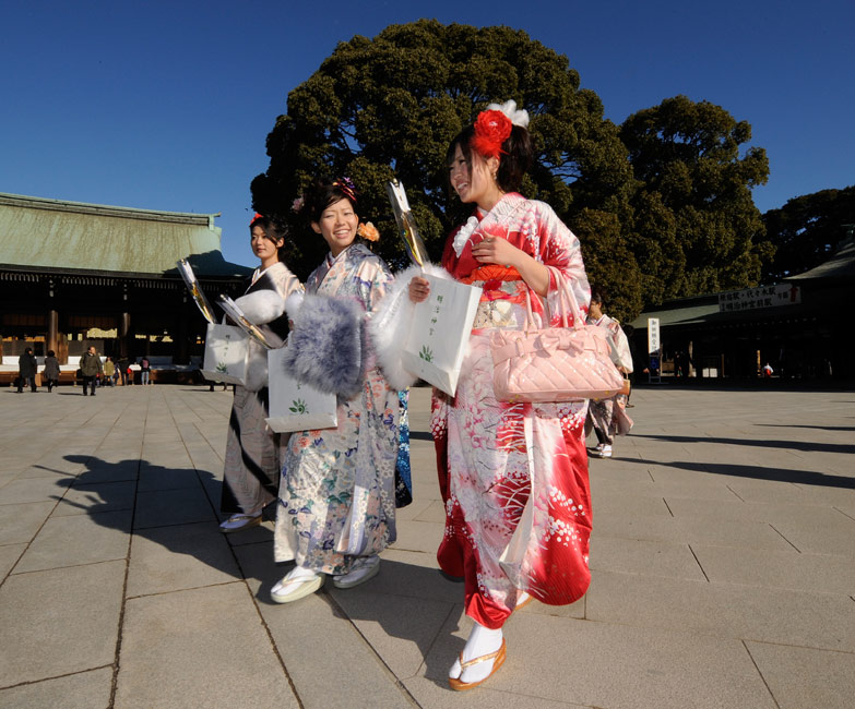 日本年輕女孩穿和服祈福迎接成人節(jié)