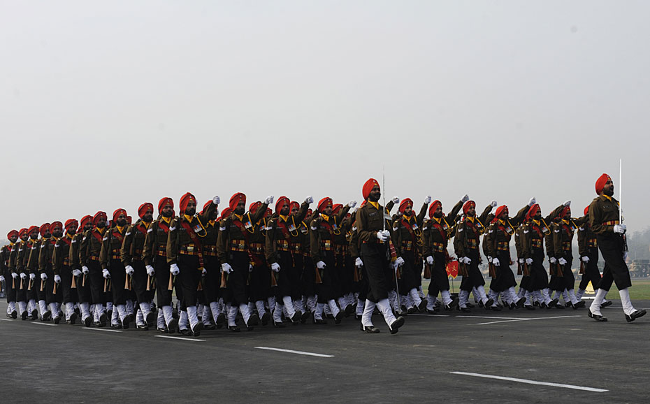 圖為印度陸軍在建軍節(jié)上進(jìn)行隊列表演。