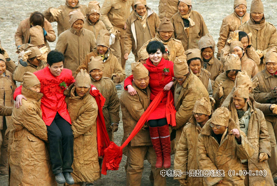 1月10日,四個"泥人”用手搭成原始花轎抬著一對新人在鄭州黃河岸邊別出心裁的舉行婚禮。新人面向孕育了中華民族五千年文明的黃河,一拜天地,二拜高堂,之后,夫妻鞠躬對拜。在世風(fēng)奢華、婚禮鋪張的當(dāng)下,一對新人在茫茫黃河邊,讓厚土為證,海誓山盟,喜結(jié)連理,以行為藝術(shù)形式表達(dá)人們保持本真、適應(yīng)環(huán)境的心聲。圖片來源:中國新聞網(wǎng)>>點擊觀看詳細(xì)內(nèi)容