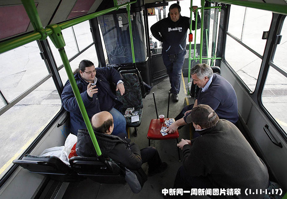 1月12日(周二),在布達(dá)佩斯一個(gè)汽車站,幾名司機(jī)在一輛城市公交車內(nèi)打牌。他們從周二開(kāi)始罷工,要求提高工資并簽訂新的勞動(dòng)合同。圖片來(lái)源:中國(guó)新聞網(wǎng)