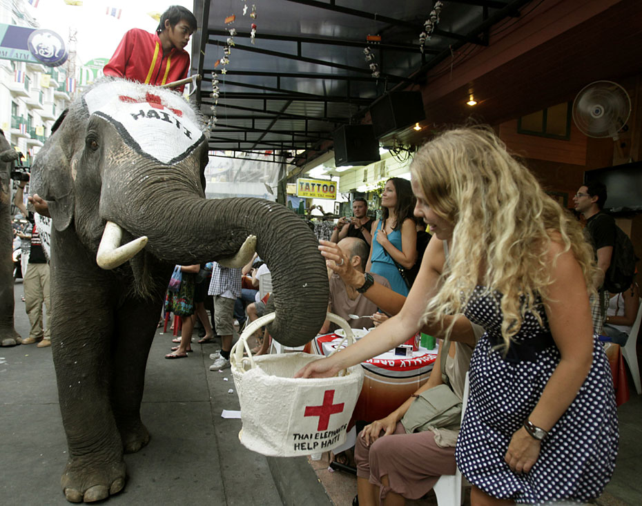 1月21日,在泰國首都曼谷舉辦了一場大象為海地災(zāi)區(qū)募捐活動。人們紛紛向大象攜帶的籃子內(nèi)放入善款,向海地地震幸存者獻上一份愛心。圖片來源:中國新聞網(wǎng)