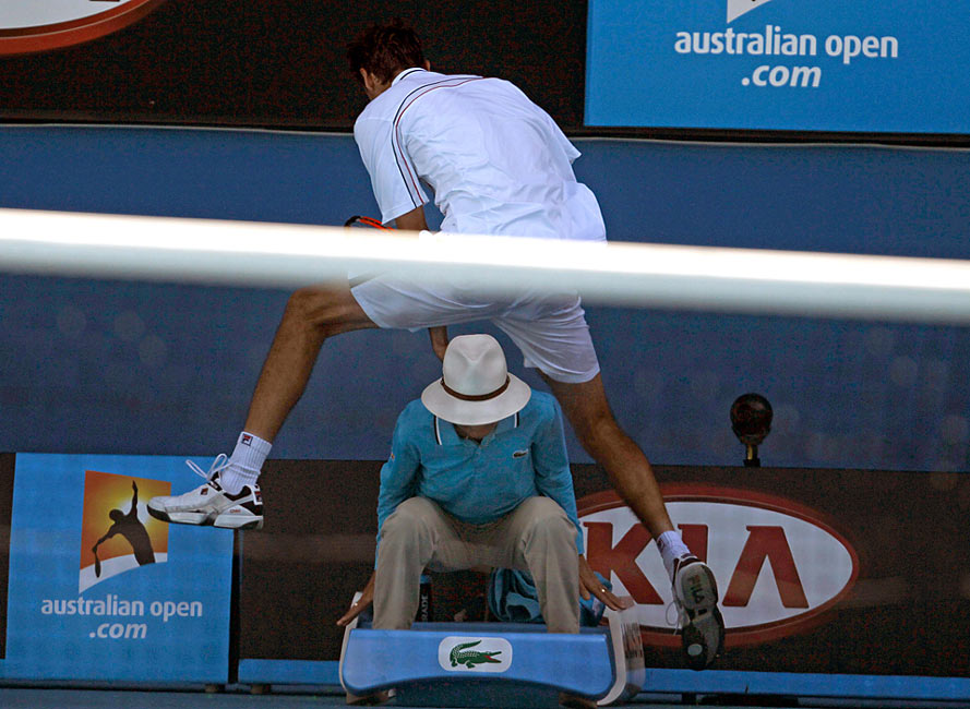 在澳網(wǎng)男子四分之一決賽上,克羅地亞選手西里奇(Marin Cilic)在對(duì)陣美國(guó)選手羅迪克(Andy Roddick)時(shí)為救球從邊裁頭頂跳過。