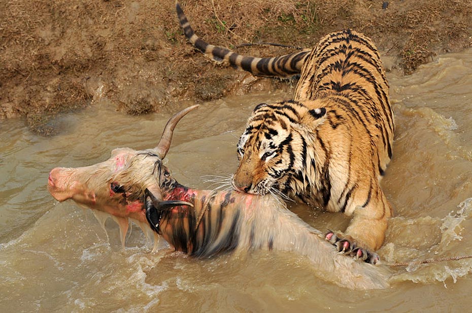 但水中的牦牛一動彈,更加激發(fā)了老虎的野性,這時有三、四只老虎撲了上來,工作人員拼命往水塘邊上拽牦牛,無奈一只虎王一下就咬住了牦牛的脖子怎么都不肯松口,繼而上演了人和老虎的“拔河比賽”。