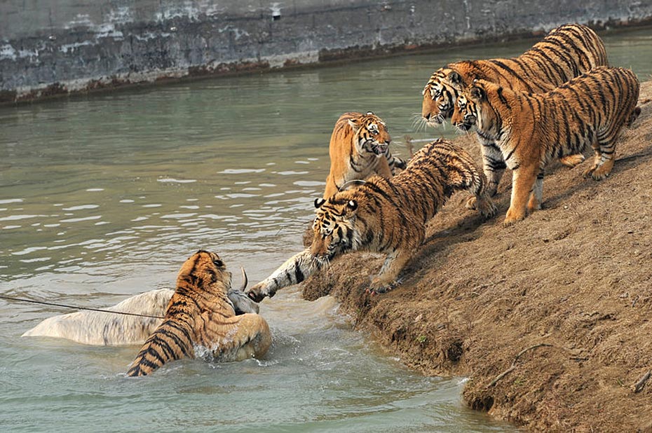 但水中的牦牛一動(dòng)彈,更加激發(fā)了老虎的野性,這時(shí)有三、四只老虎撲了上來(lái),工作人員拼命往水塘邊上拽牦牛,無(wú)奈一只虎王一下就咬住了牦牛的脖子怎么都不肯松口,繼而上演了人和老虎的“拔河比賽”。