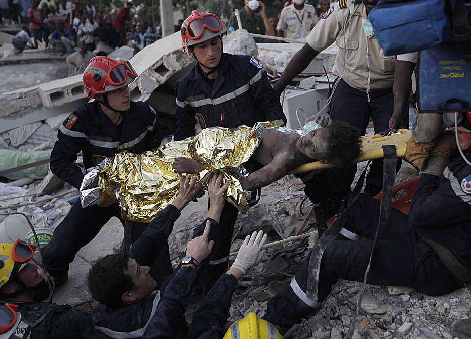 2010年1月27日,海地太子港,法國救援人員在一棟房屋的廢墟下救出被困15天的16歲女孩黛琳娜·艾提尼(Daline Etienne)。女孩微弱的話語讓大家著實(shí)吃驚:她竟是憑著隨身的可樂挺了過來。圖片來源:中國新聞網(wǎng)