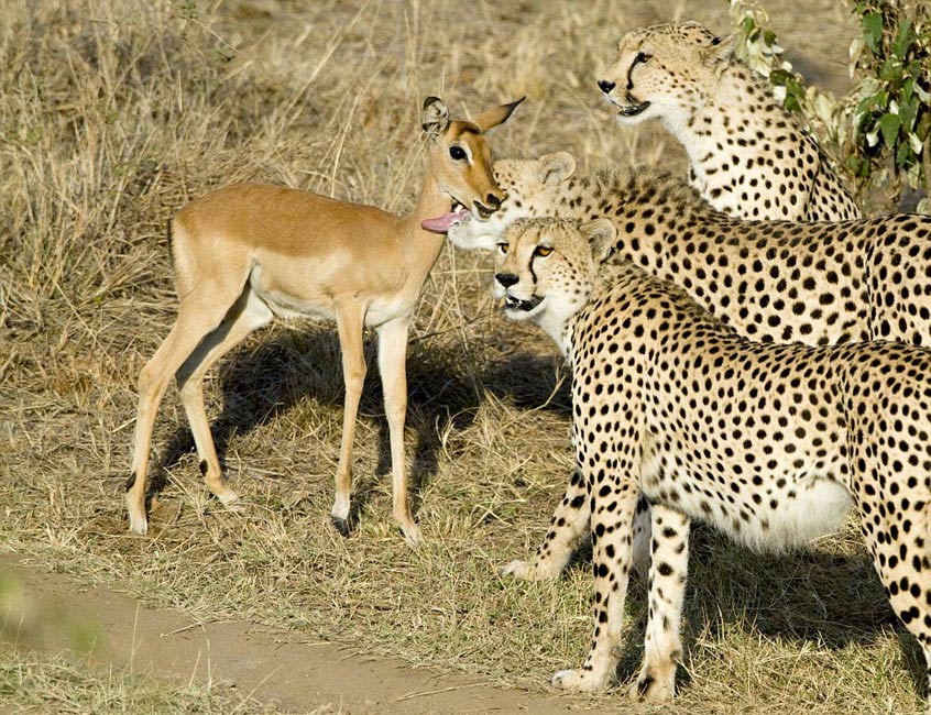 據(jù)英國媒體28日報道,一名在肯尼亞野生動物保護(hù)區(qū)拍照的攝影師拍到令人驚訝的畫面:三只獵豹與一只本是其獵物的小羚羊竟然和睦相處,共同嬉戲玩鬧,完全沒有危險“天敵”的概念。小羚羊最終毫發(fā)無傷地逃生成功。