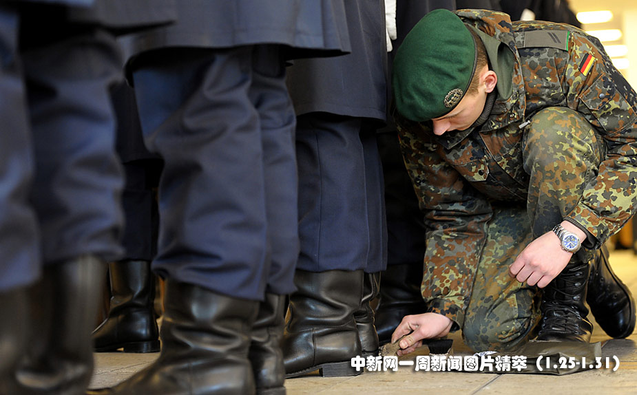1月25日(周一),在柏林機(jī)場(chǎng),為迎接以色列總統(tǒng)佩雷斯的到來(lái)。一名士兵正為儀仗隊(duì)士兵的皮靴上鞋油。圖片來(lái)源:中國(guó)新聞網(wǎng)