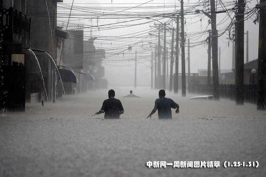 1月25日(周二),人們在巴西圣保羅洪水淹沒的街道上艱難淌過。圖片來源:中國新聞網(wǎng)