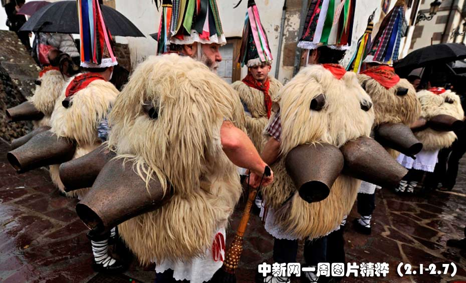 2月1日(周一),在西班牙Ituren村舉行的傳統(tǒng)游行上,身穿羊皮服飾的男子走街穿巷,驅(qū)趕土地上的惡魔,迎接春天的到來。圖片來源:中國(guó)新聞網(wǎng)