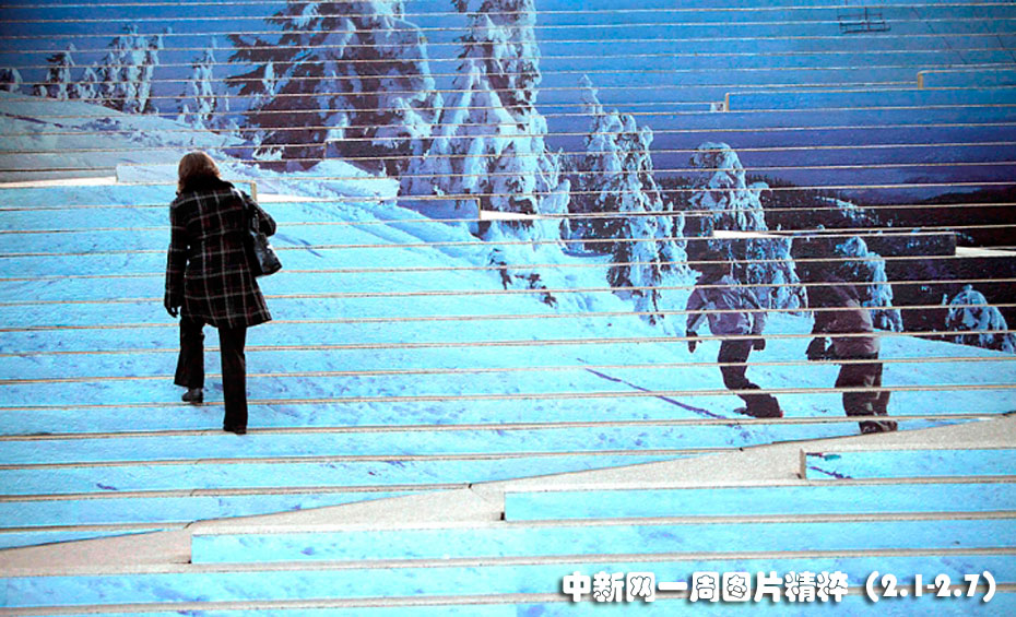 2月2日(周二),在溫哥華不列顛哥倫比亞市,一位女士在覆蓋了滑雪圖的樓梯上行進。溫哥華冬奧會于2010年2月12日開幕。圖片來源:中國新聞網(wǎng)