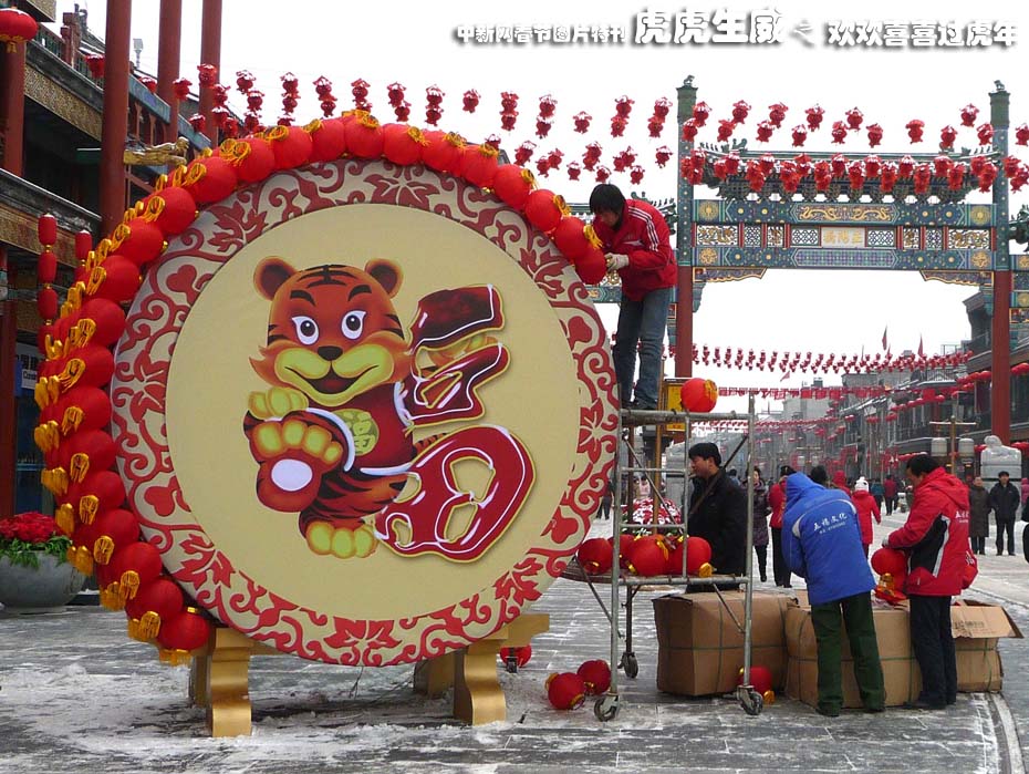 2月7日,兩個直徑3米左右的巨型“虎鼓”景觀亮相北京前門大街,與萬盞大紅燈籠交相輝映構成一道充滿喜慶氛圍的靚麗風景,盛裝迎接虎年新春的到來。中新社發(fā) 玉龍 攝