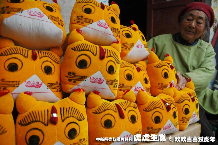 1月19日,河南省淮陽縣民間老藝人馬玲賢與她制作的“布老虎”在一起。今年85歲的馬玲賢老太太制作“布老虎”已經(jīng)有近20年,她制作的“布老虎”工藝精良,造型天稚氣可愛。中新社發(fā) 楊正華 攝