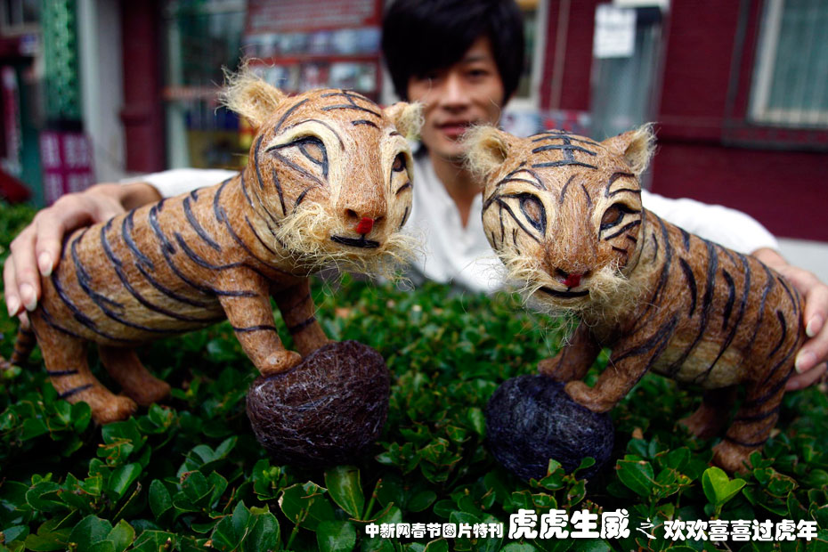 2009年11月9日,北京一位時(shí)尚發(fā)型設(shè)計(jì)師正在展示頭發(fā)絲作品“;⑸裢辟R歲虎年。這是祖國(guó)60華誕之后的又一新作,四川青年理發(fā)師黃鑫用2.6公斤碎頭發(fā)制作了一對(duì)可愛逼真的“;ⅰ,歷時(shí)兩個(gè)多月的時(shí)間才完工。中新社發(fā) 鄭雄增 攝