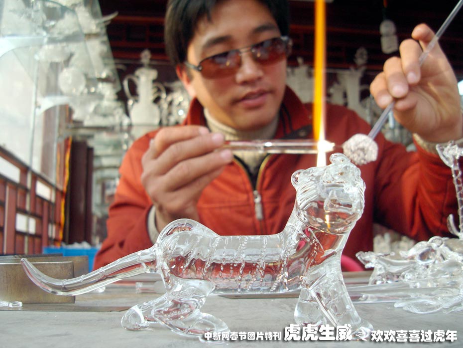 1月29日,蘇州市民間藝人馬強(qiáng)在工藝亭里利用玻璃拉絲絕技燒制而成的生肖虎飾品,造型逼真,吸引了眾多游人的目光。中新社發(fā) 王建康 攝