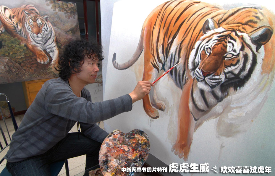 12月15日,遼寧省凌海市新莊子鄉(xiāng)禮中村的返鄉(xiāng)農(nóng)民工劉玉紅利用打工時(shí)學(xué)到的畫畫技藝,回鄉(xiāng)自主創(chuàng)業(yè)。他把中國(guó)畫傳統(tǒng)技法與油畫結(jié)合,創(chuàng)作一系列以“虎”為主題的作品,被不少國(guó)內(nèi)外美術(shù)愛(ài)好者收藏,成功實(shí)現(xiàn)再就業(yè)。中新社發(fā) 李鐵成jz 攝