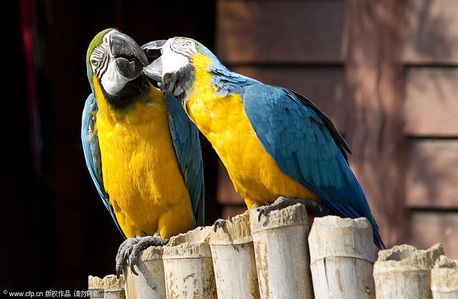 圖為上海野生動(dòng)物園,一對(duì)金剛鸚鵡在相互梳理羽毛。劉行喆/CFP
