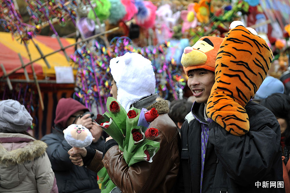 2月14日,農(nóng)歷正月初一,北京各大傳統(tǒng)廟會、洋廟會爭相開幕,許多游客頭戴虎年飾品開心游廟會。中新網(wǎng)記者 金碩 攝
