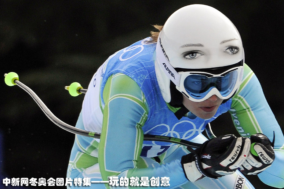 速降滑雪賽場上,斯洛文尼亞美女選手頭戴“美女”頭盔。圖片來源:中國新聞網(wǎng)