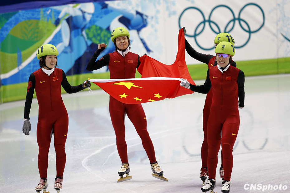 當(dāng)?shù)貢r(shí)間2月24日,溫哥華冬奧會(huì)女子短道速滑3000米接力A組決賽中,中國(guó)隊(duì)王濛、周洋、孫琳琳、張會(huì)四朵金花聯(lián)袂出擊,最終將金牌歸入中國(guó)隊(duì)囊中。圖片來(lái)源:中國(guó)新聞網(wǎng)
