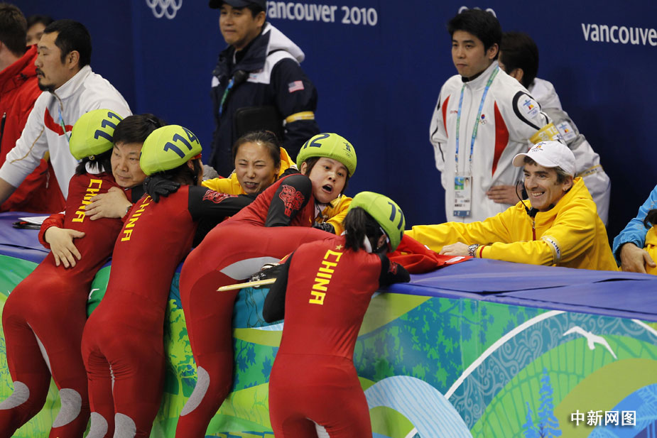 在裁判宣布韓國隊犯規(guī)后,一直等候著最終結(jié)果的中國姑娘忘情地撲向教練席。圖片清楚地顯示,興奮的王濛撲到教練李琰前面寬寬的防護墊上,她的右腿無意間高高抬起,冰刀刮到了跟在她身后的張會的下巴。王濛意識到自己闖了禍,馬上關(guān)切地回頭察看張會的傷情。四位姑娘舉著國旗慶祝勝利時,張會用手捂著她的下巴,漸漸地鮮血浸濕了她的手套。