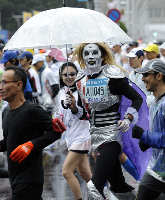 2月28日,日本東京馬拉松賽舉行,超過30000名愛好者參加了此次馬拉松賽。很多參賽者的怪異服裝成為了賽場上的一道風景。圖片來源:中國新聞網