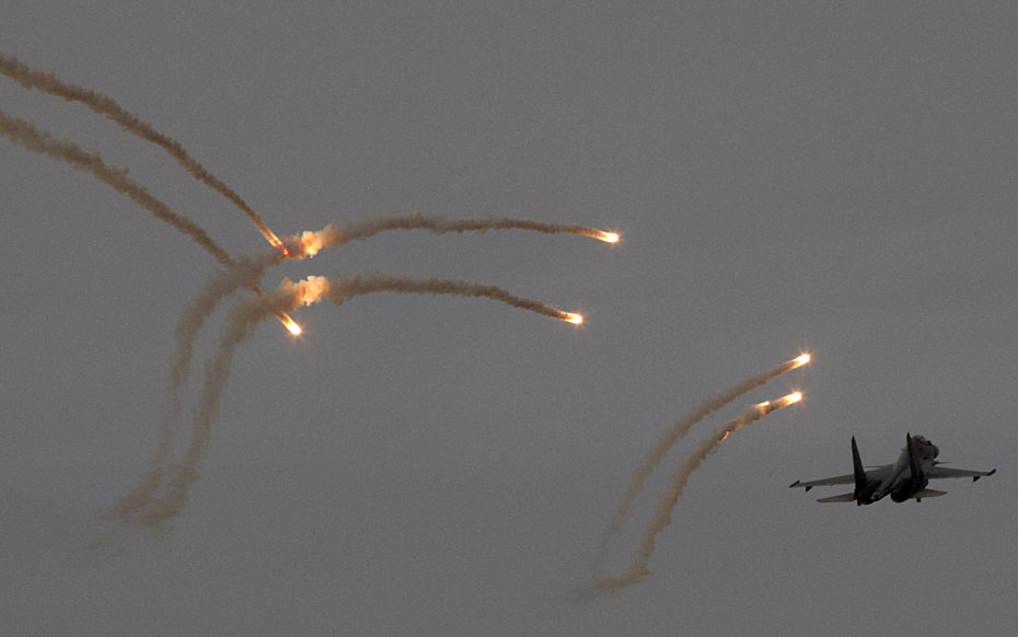 2月28日,印度空軍在該國西部地區(qū)舉行大規(guī)?罩谢鹆φ故狙萘(xí),出動(dòng)了包括“費(fèi)爾康”空中預(yù)警機(jī)、蘇-30戰(zhàn)斗機(jī)、米格-29戰(zhàn)斗機(jī)、幻影-2000戰(zhàn)斗機(jī)、伊爾-76運(yùn)輸機(jī)和米-35武裝直升機(jī)等約百架戰(zhàn)機(jī)。圖片來源:中國新聞網(wǎng)
