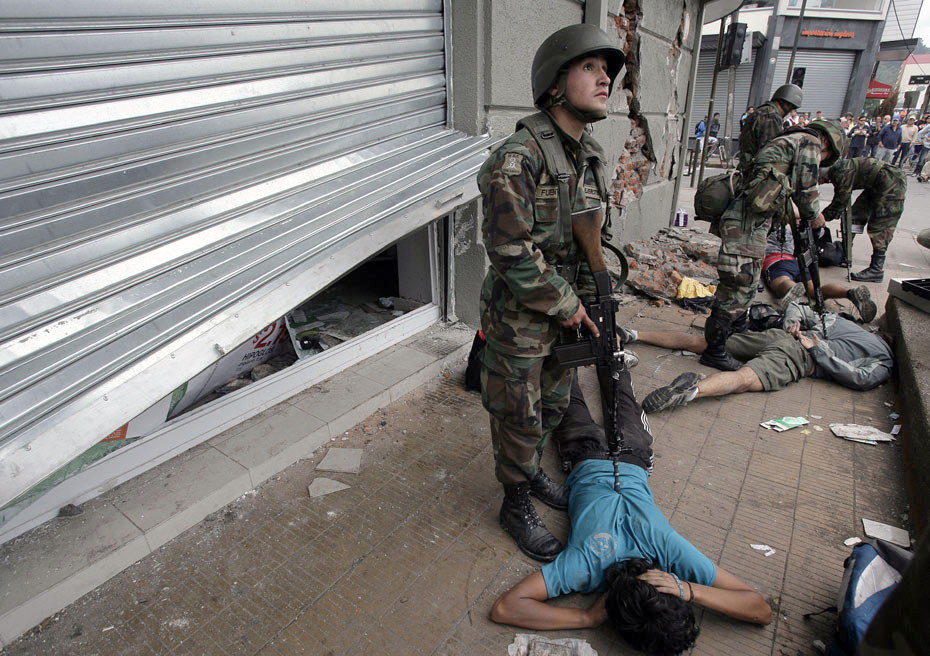 3月2日,智利軍警在街頭維持秩序。智利總統(tǒng)巴切萊特當(dāng)日說,政府派往災(zāi)區(qū)維持治安的軍人數(shù)量已達(dá)14000人,地震重災(zāi)區(qū)的搶劫現(xiàn)象已得到控制。圖片來源:中國新聞網(wǎng)