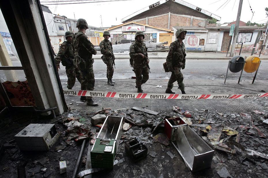 3月2日,智利軍警在街頭維持秩序。智利總統(tǒng)巴切萊特當日說,政府派往災(zāi)區(qū)維持治安的軍人數(shù)量已達14000人,地震重災(zāi)區(qū)的搶劫現(xiàn)象已得到控制。圖片來源:中國新聞網(wǎng)