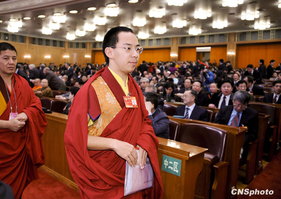 3月3日下午,全國(guó)政協(xié)十一屆三次會(huì)議在北京人民大會(huì)堂開(kāi)幕,十一世班禪額爾德尼·確吉杰布出席會(huì)議。中新社發(fā) 廖攀 攝