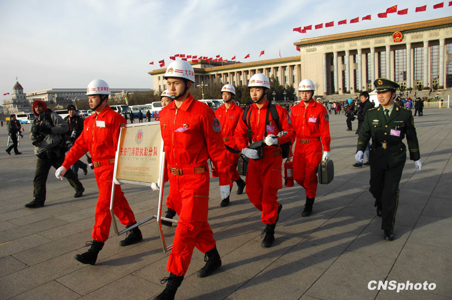 3月5日上午9時(shí),十一屆全國(guó)人大三次會(huì)議在北京隆重開幕。國(guó)務(wù)院總理溫家寶作政府工作報(bào)告。圖為武警消防官兵提前進(jìn)入天安門廣場(chǎng),保障會(huì)議安全。中新社發(fā) 柯小軍 攝
