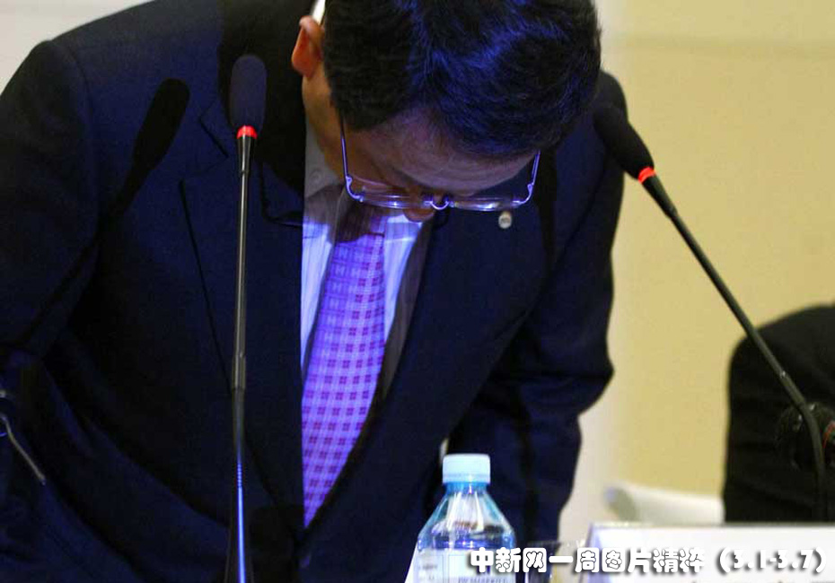 3月1日,豐田汽車總裁豐田章男今日在北京舉行記者會,介紹了豐田汽車大規(guī)模召回的原因及處理措施,并向中國消費(fèi)者鞠躬道歉。圖片來源:中國新聞網(wǎng)