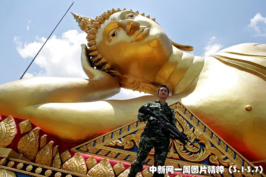 3月4日,在泰國(guó)也拉府的一所寺廟中,一名士兵持槍站在一尊佛像前,確保寺廟在動(dòng)蕩中不受損害。圖片來(lái)源:中國(guó)新聞網(wǎng)