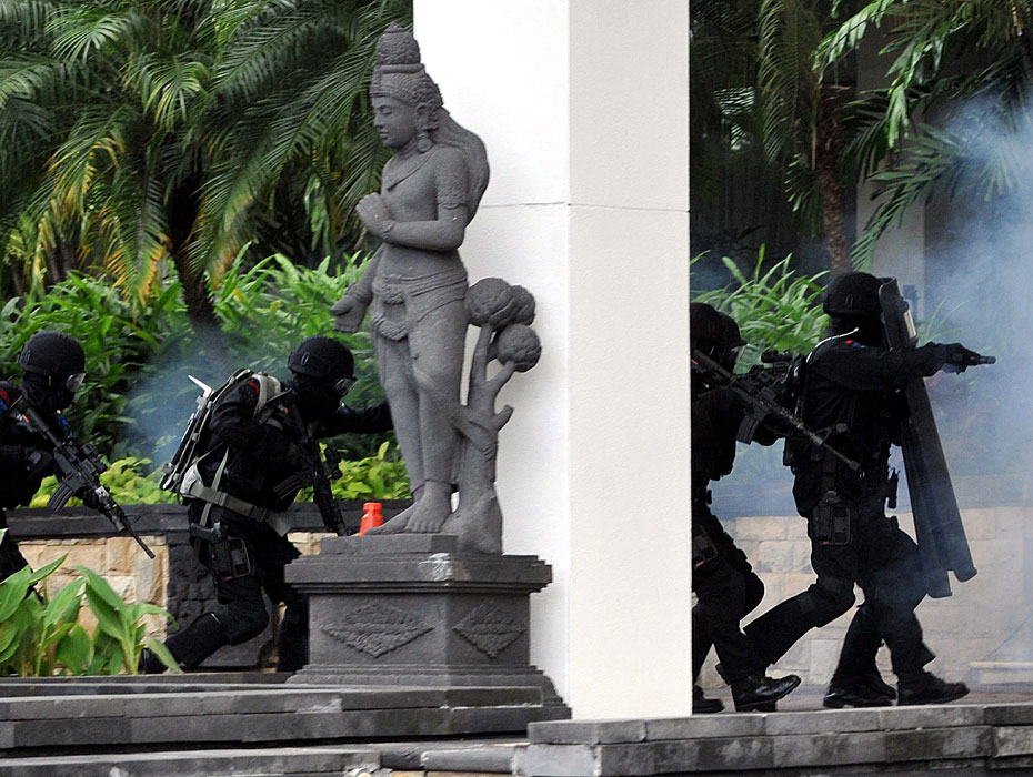 3月13日,印尼警方在首都雅加達(dá)的證券交易所舉行了一場(chǎng)反恐演習(xí),為本月底即將到訪(fǎng)印尼的美國(guó)總統(tǒng)奧巴馬創(chuàng)造安全的環(huán)境。圖片來(lái)源:中國(guó)新聞網(wǎng)