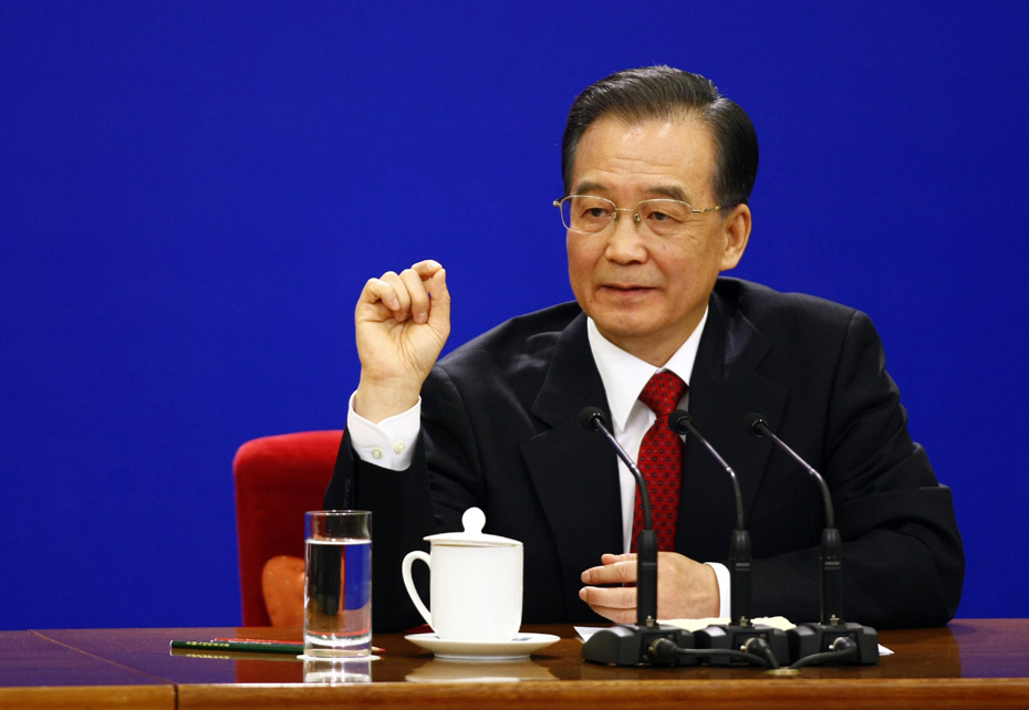 3月14日上午,國(guó)務(wù)院總理溫家寶在人民大會(huì)堂三樓金色大廳與采訪十一屆全國(guó)人大三次會(huì)議的中外記者見面并回答記者提出的問題。中新社記者 杜洋 攝 圖片來源:中國(guó)新聞網(wǎng)
