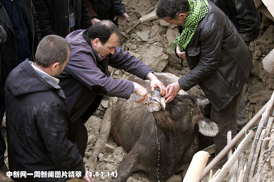 周二在土耳其奧克丘拉爾,人們試圖解救一頭被困在廢墟中的牛。土耳其此前一天發(fā)生的強(qiáng)烈地震造成至少50人遇難。圖片來源:中國新聞網(wǎng)