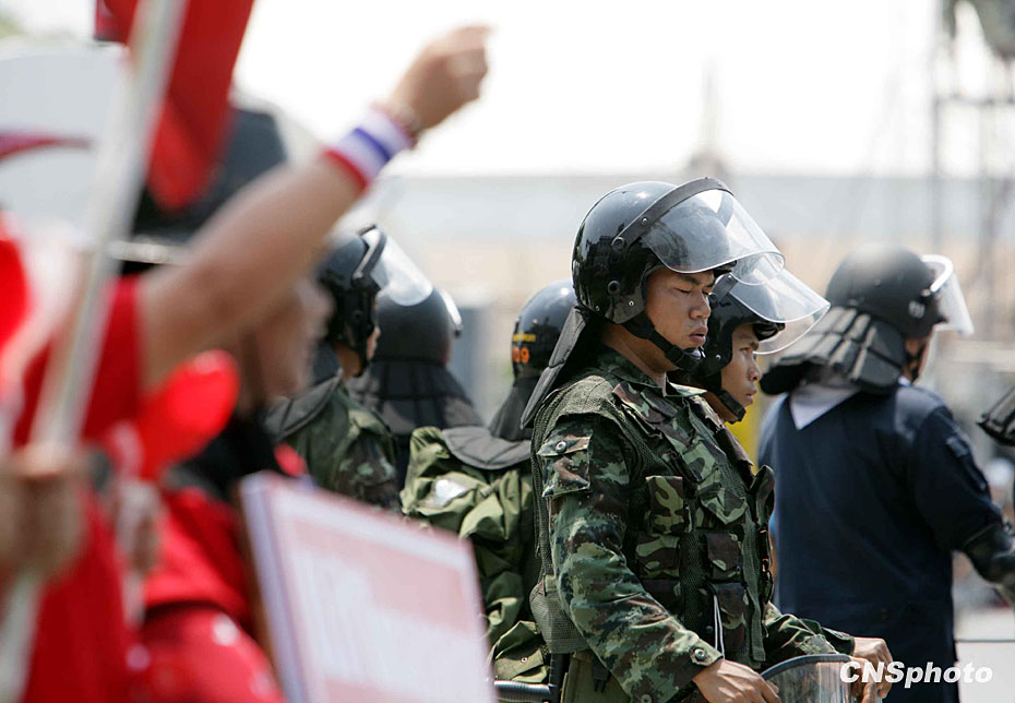 3月13日起,泰國“紅衫軍”陸續(xù)從泰國北部、東北部等外府進入曼谷市,在集會主會場搭設演講舞臺和帳篷,拉開大規(guī)模示威序幕。圖片來源:中國新聞網