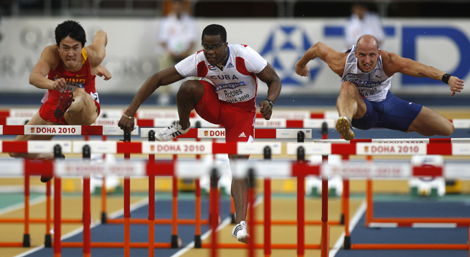 在14日晚間結(jié)束的多哈室內(nèi)田徑世錦賽60米欄決賽中,劉翔僅僅以7秒65的成績獲得第七名。古巴選手羅伯斯則以7秒34成績奪得冠軍并打破室內(nèi)世錦賽賽會紀(jì)錄。圖片來源:中國新聞網(wǎng)