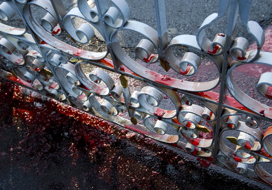 泰國反政府組織“紅衫軍”成員將血液潑灑在曼谷總理府門前,以此向政府施壓要求解散國會下議院。圖片來源:中國新聞網(wǎng)