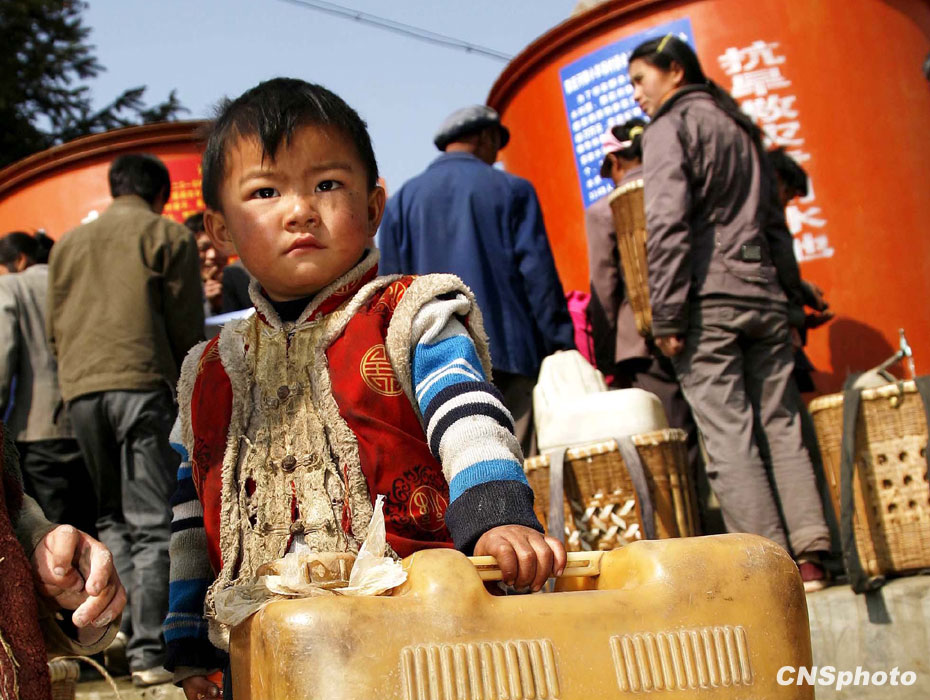 3月12日,在云南省富源縣小羊場村口等待取水的兒童。中新社發(fā) 劉冉陽 攝