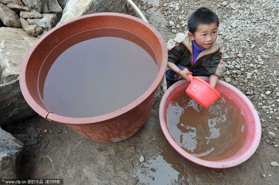 3月16日,貴州省開陽縣城關(guān)鎮(zhèn)青西村村民付燕子帶著孩子在水庫底找水。連日來,貴州省旱情加劇,貴陽市郊開陽縣城關(guān)鎮(zhèn)居民飲水源青西村水庫幾乎干涸。貴州省開陽縣城關(guān)鎮(zhèn)青西村一兒童在接水。吳東俊/CFP