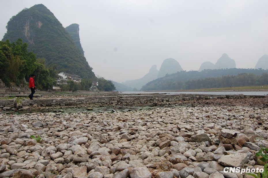 3月17日,受廣西50年不遇旱情影響,漓江水位持續(xù)下降,漓江游覽航線縮短。圖為陽朔碼頭露出河床的漓江。中新社發(fā) 諸葛保滿 攝