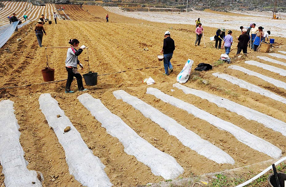 3月14日,貴州省長(zhǎng)順縣宂雷村村民正在加緊補(bǔ)種早熟玉米,并利用覆膜技術(shù)保持土壤水分。圖片來(lái)源:新華網(wǎng) 劉續(xù) 攝