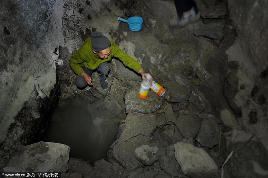 3月18日,貴州省息烽縣流長(zhǎng)鄉(xiāng)新中村村民在從沒(méi)有干得如此嚴(yán)重的深井里取水。 吳東俊/CFP
